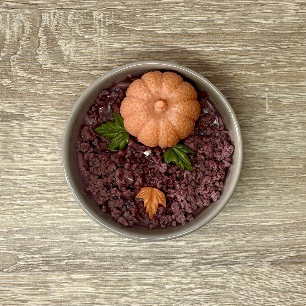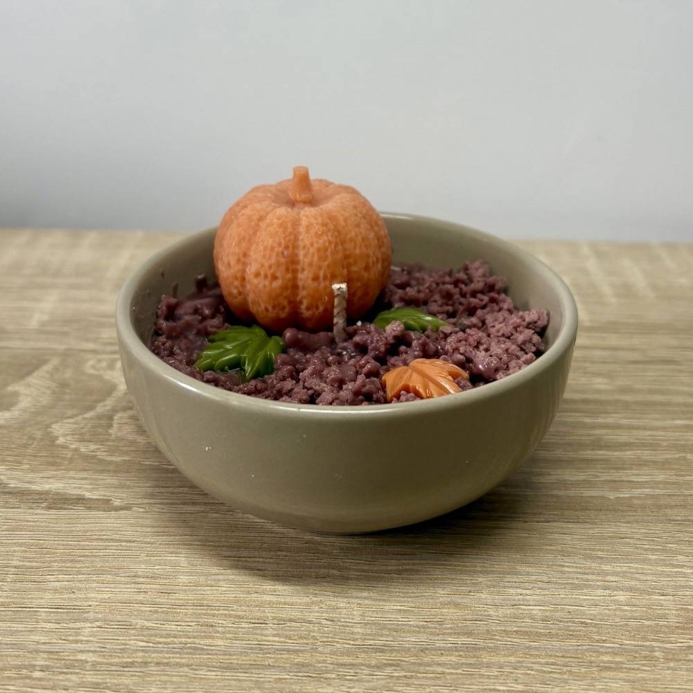 Bougie artisanale, décorée d’une mini-citrouille et de feuilles en cire sur un lit de terre en cire. Un parfum chaleureux de citrouille et d’épices qui emplit la maison d’une douce ambiance automnale.