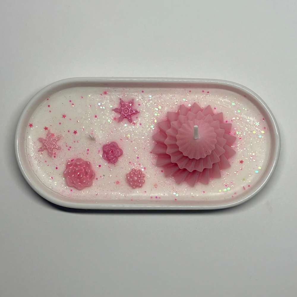 Bougie décorative parfum Mon Sapin de Noël, dans un joli plateau rose orné d’un sapin plissé et de petites fleurs scintillantes.