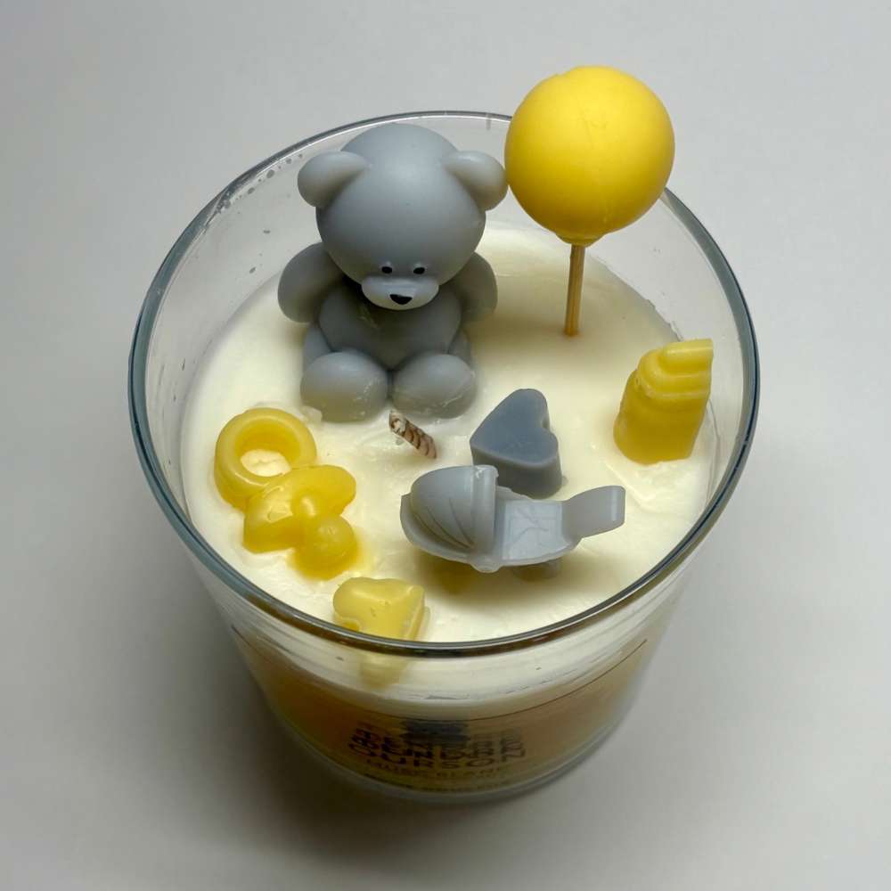 Bougie Tendre Ourson au parfum musc blanc, décorée d’un petit ourson gris et d’adorables mini accessoires.